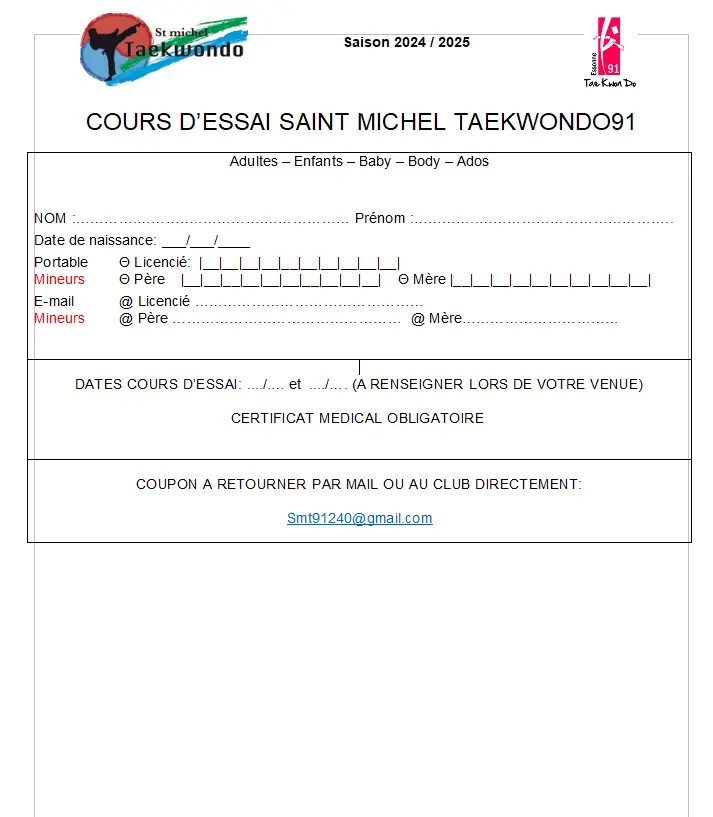 trouvez ci-dessous la feuille à remplir pour essayer le taekwondo au SMT91